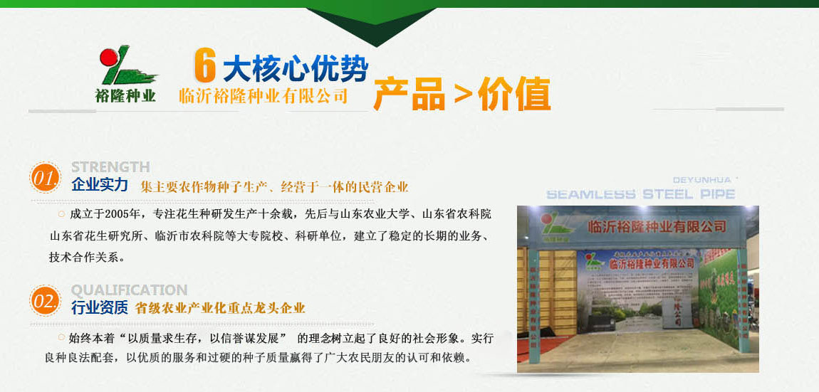 臨沂裕隆種業(yè)有限公司成立于2005年,是一家集主要農作物種子生產、經營于一體的民營企業(yè)。公司成立以來,立足當地優(yōu)越的土地、氣候、自然隔離等優(yōu)勢條件,以發(fā)展小麥、花生、蔬菜良種繁育為主,同時代理經營玉米、化肥等農作物良種及肥料。目前主要經營各類花生種子,小麥種子,玉米種子,蔬菜種子及專用復合肥料。
